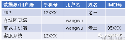ID Mapping 有几个场景:1、多端数据的识别;2、多源数据的打通。这两种情况的处理方式基本是一样的。先举一个例子:老王在商城PC端浏览商品,在手机端下单,后台自动生成订单,交给ERP进行后续的订单、物流处理。后来老王有点不耐烦,给供应链金融客服打电话咨询。那么老王的数据如下:\