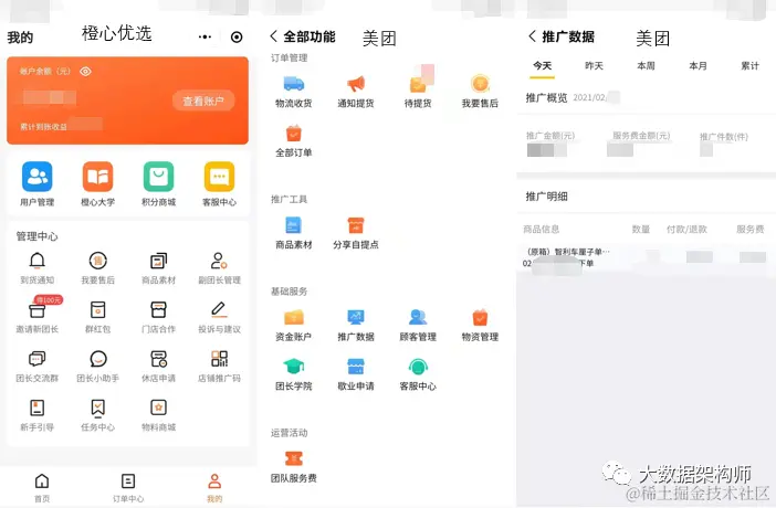 我让马总截了几个图,你们感受一下。这张图是橙心优选和美团,美团还好,有个近N天的推广概览和明细。橙心优选干脆就是一个订单中心直接搞定。