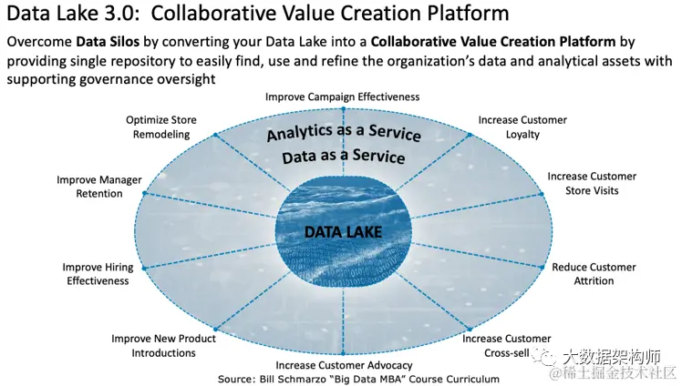 如果您想利用数据的独特特性--这些资产永不枯竭、永不磨损,并且可以在无限多的用例中以零边际成本使用,那么您必须打破阻碍数据经济乘数效应的数据孤岛。我们可以通过将组织的数据湖转化为一个“协同创造价值”的平台,支持组织数据和分析资产的采集、共享、重用和不断完善,来释放数据经济乘数效应(见图3)。