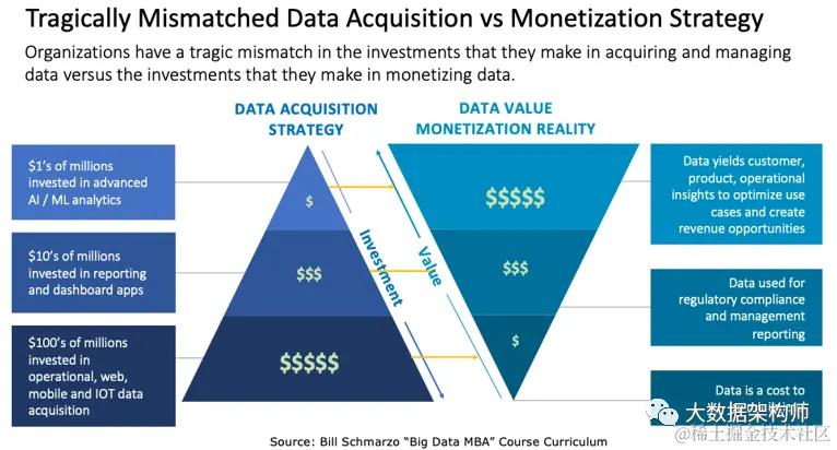 如果我们真正相信数据是新的石油——数据将成为21世纪经济增长的催化剂,那么我们就需要花费更少的时间和投资来管理和治理数据,并大幅增加时间和投资来实现数据货币化。如果你不知道该花多少钱,我可以告诉你一个参考:贝壳的“楼盘字典”到2017年就花了4、5个亿。