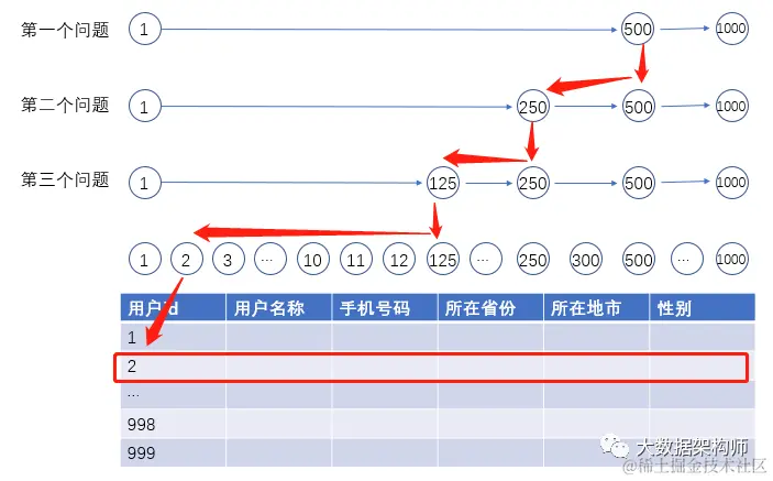 不过我这张图画的不好,有人会问,这从1开始找不是第二条就找到了么?咱看图看意哈,这个思想可以搞定千万、亿级甚至更多数据的快速查找和锁定。