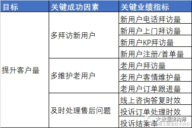 达成这个目标的关键成功因素为:多拜访新用户,多维护老用户,及时处理售后问题。