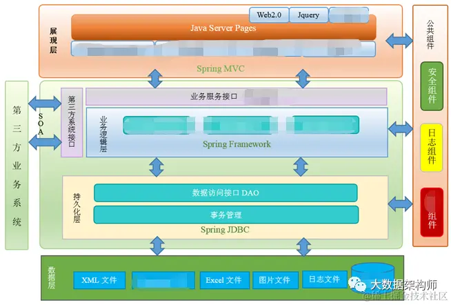 在设计的时候,会用到很多种设计模式,比如你看到有一个应用支撑层/服务层之类的,这就是做了一个MVC,把业务逻辑和用户前端分离。而所有的逻辑架构都有数据层,这是最早的MVP,即数据、用户视图和处理逻辑分离。当然,系统越复杂,架构图就越复杂。这里只是给一个简单的图供你参考了。