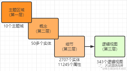 在FSLDM里,整个模型分为三层:主题、概念、细节。一共10个主题域、小3千个实体和1万多个属性。根据第三层细节中已经梳理出来的内容,构建了343个逻辑视图。