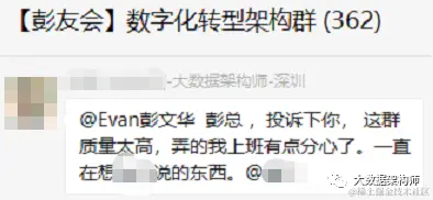 “这个群学习氛围很足,因为大家都在面临国家提出数字化转型的这个题目,一边思考一边学习,每个企业都有其特殊性和优缺点,在这里的观念碰撞可以使我们思路更加清晰,对未来的目标也更加肯定。每天在这里看大佬们聊天也是必修的功课。”