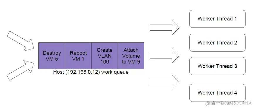 在ZStack中的任务是由消息驱动的,聚合消息让相关的任务可以在同样的节点执行,减轻了经典的线程池并发编程的压力。为了避免锁竞争,ZStack使用工作队列替代锁和信号量。同步化的任务可以一个接一个的执行,它们由基于内存的工作队列维护: