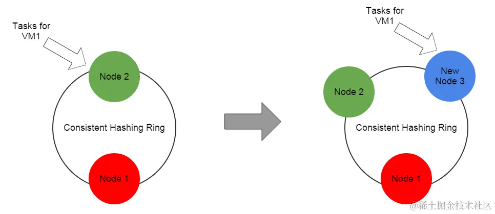 虽然基于无锁架构的队列可以处理99.99%的时间同步,但是有一个争用条件从一致的散列算法中产生:一个新加入的节点将分担一部分相邻节点的工作量,这就是一致的散列环的扩张的结果。