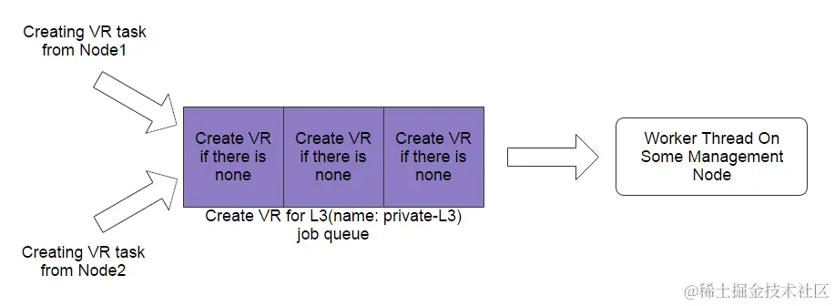 基于内存的工作队列简单快速,它满足了在单一管理节点99%的同步和并行的需要; 然而,与创建资源相关的任务,可能需要在不同管理节点之间做同步。一致性哈希环基于资源UUID来工作,如果资源未被创建,它将无法得知哪个节点应该处理这个创建的工作。在大多数情况下,如果要创建的资源不依赖于其它未完成的任务,ZStack会选择,此创建任务的提交者所在的本地节点,来完成这个工作。不幸的是,这些不间断的任务依赖于名为虚拟路由VM的特殊资源; 例如,如果使用同样的L3网络的多个用户VM,由运行于不同管理节点的任务创建而成,同时在L3网络上并无虚拟路由VM,那么创建虚拟路由VM的任务则可能由多个管理节点提交。在这种情况下,由于存在分布式同步的问题,ZStack使用基于数据库的作业队列,这样来自不同管理节点的任务就可以实现全局同步。