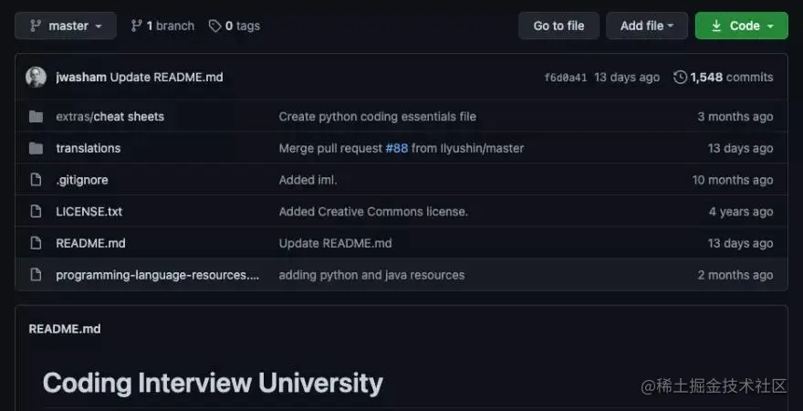 建议你查看这个仓库并自己去阅读它,同时它是综合性的,你不需要学习所有的东西,或者一次学习所有的东西。但即便如此,这本书对于准备面试的程序员来说是非常方便的。