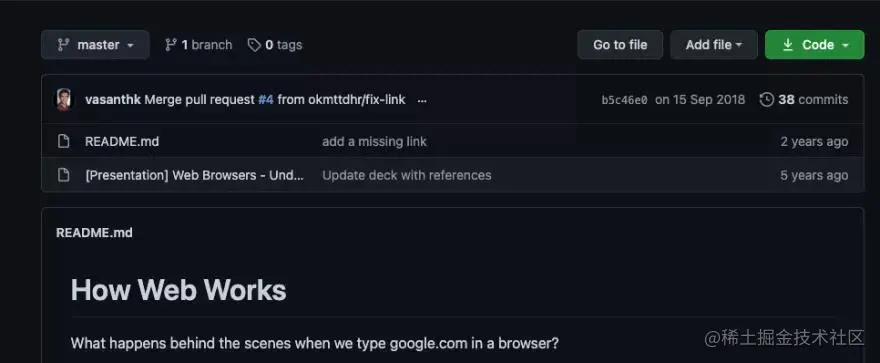 在我的第一份开发者工作面试中,面试官问我:在浏览器中输入URL时会发生什么?”当时这个问题把我难住了,同样的,未来的你可能也会遇到同样的问题。你可以在名为“How Web Works”的Repo中找到这些问题的答案,你还可以找到关于DNS、HTTP协议和服务器如何工作的信息,或者关于DOM树、呈现树、页面绘制等信息,该项目是学习Web工作原理和基础知识的存储库,此外,该存储库还包含了很多链接,用于深入研究某些主题。
