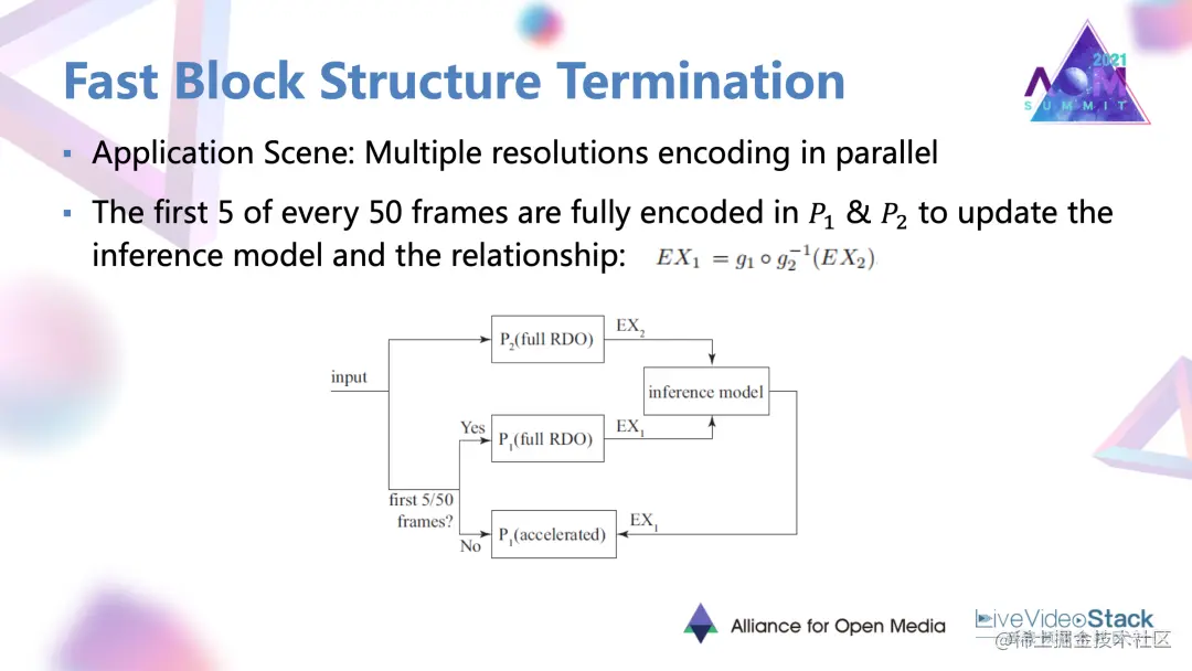 理论去具体去用的时候会存在应用场景。这个场景就是多分辨率同时编码的一个情况。这种场景在一些流媒体的服务器端是经常存在的。在具体实现的时候对于编码的每50帧,所有的50帧都是对于低分辨率,都是常规的进行RDO去进行完整编码,对于50帧里的前5帧的高分辨率编码,它也是进行完整的 RDO过程,然后会得到 E(X1)以及低分辨率的E(X2)的划分结果。首先要通过一个influence Model去推理出这两种划分结果的一个映射关系。基于前5帧的一个结果,对于之后的90%,大概是45帧,利用 influence结果以及实际编码的低分辨率划分结果,直接去推导出高分辨率的划分结果,不再进行完整的RDO,达到一个加速的目的。