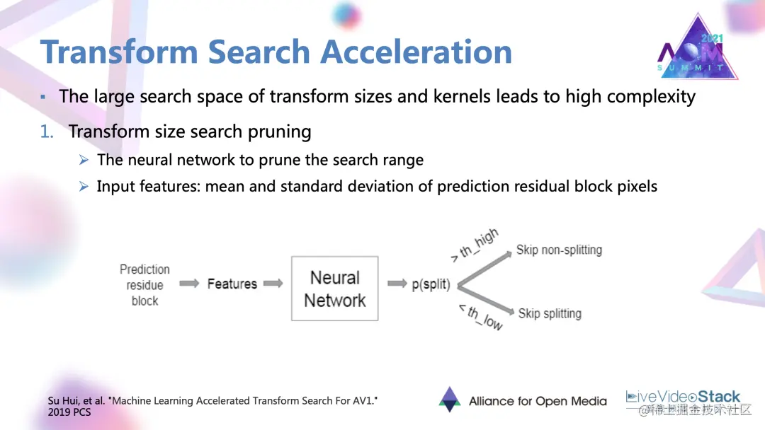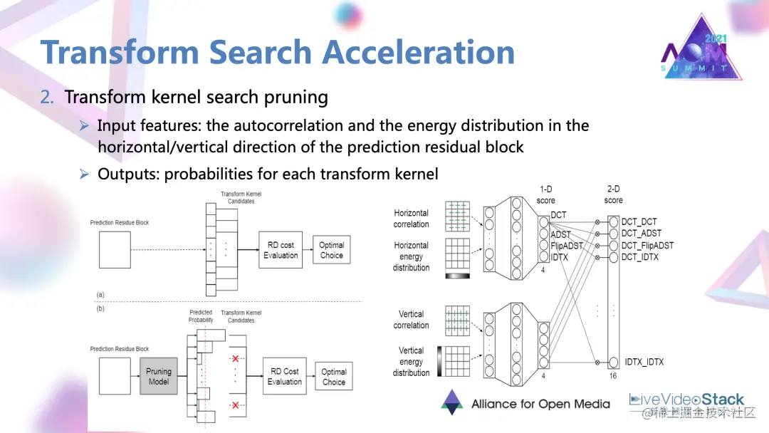 最后是一个变换搜索的加速方法。AV1提供了很丰富的变化和带来了很大的复杂度。这一个工作是对变换尺寸以及变换核搜索进行一个裁剪。