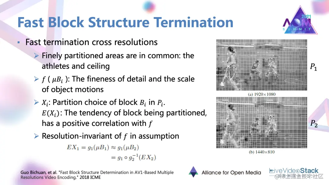 首先要介绍的是一个块划分的加速方法,这个方法可以算作一个传统的路径。比较特殊的点在于它是基于跨分辨率的加速方法。首先是对同一视频在不同分辨率下的块划分情况进行了一个查看,发现精细的分割区域其实是共通的或者说相似的,主要是一些复杂的纹理以及快速运动的物体。基于这个现象,这个文章中就假定了一种特征f,它是表现细节的精细度以及物体运动快慢程度的一个特征。有了这样一个特征后,每个块被划分的概率或者趋势E(X),与这种特征有一个正相关的关系,进一步的去假定这个特征。f有一个分辨率不变性以后,那f就可以与两种或者多种分辨率的划分结果。比如说E(X1)、E(X2)有两种映射关系,比如说g1和g2。进一步把这个f作为中间连接的一个桥梁以后,最终可以达到这样一种目的:在得到一个低分辨率的块划分结果E(X2)以后,就可以通过反映射的方式转换为高分辨率的划分结果。通过推导后,实际上,f就并不用具体的去提取某一种特征,只是在推导里面被用到。