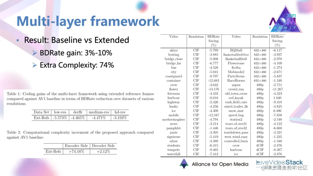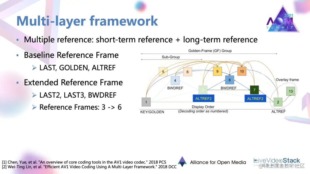 这个框架目前应用在 AV1官方编码器Libaom中,用到短期参考和长期参考,多参考帧的概念去适应不同运动内容,不同运动特性,或者不同种类内容的视频,去达到一个更好的帧间预测。