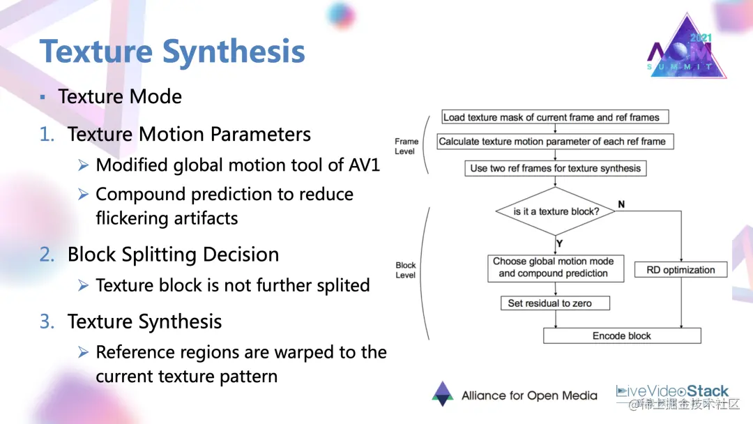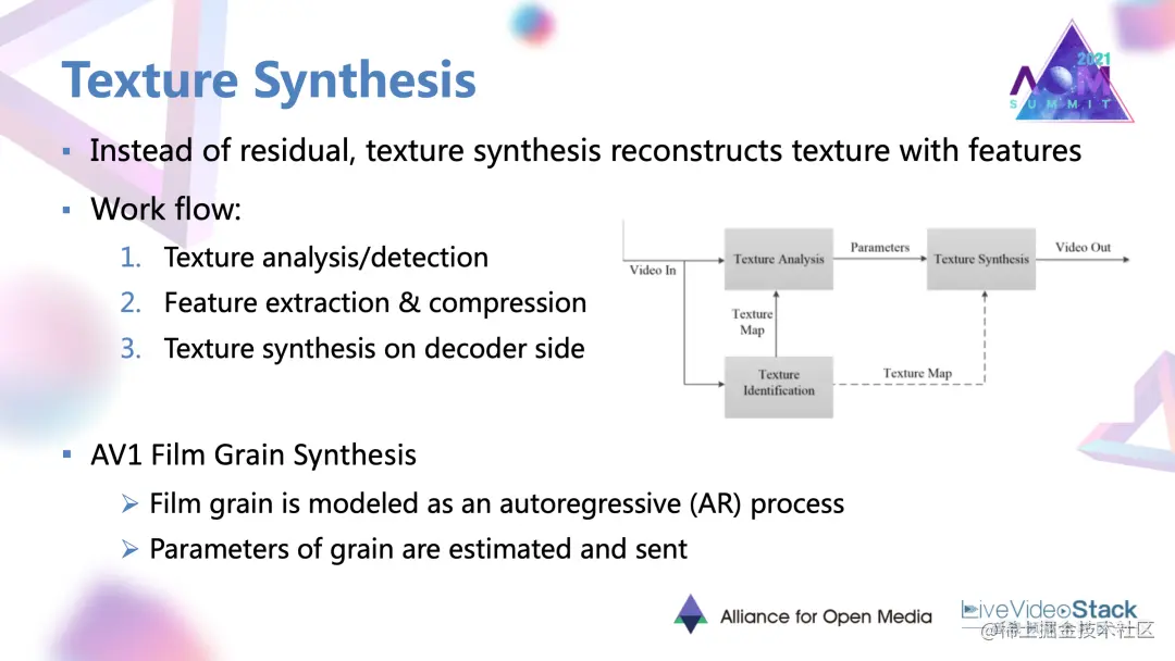 它的一个常规的工作流主要包含首先是对纹理进行探测,那些被认为是纹理的区域,就直接去对特征进行编码,并传到解码端,在解码端也是利用纹理本身的这种特征去还原和合成纹理。例如刚刚提到的AV1电影颗粒合成也是一种纹理合成的方法。这个方法中电影的颗粒被建模为是一种叫做自回归AR的过程,AR的过程里面的一些系数就可以作为颗粒的参数或者表达在解码端去合成逼真的电影颗粒。