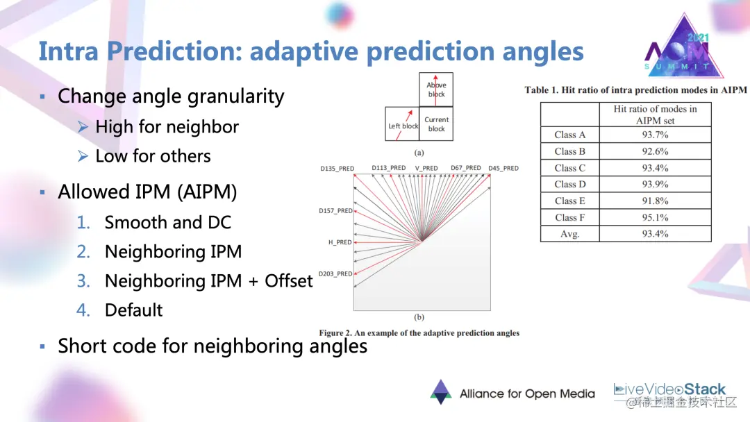 其他方向的候选角度,可以用一个粗粒度去进行选择。在此基础上它提出了一个叫做“Allowed”,叫做允许的帧内测模式集合。最大数量有40个,意思就是将AV1原有大概60多个可能的帧内模式,按照一定的优先级顺序去填满 AIPM集合。