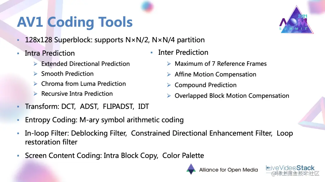 此处是对AV1新增的一些核心编码工具进行了一些整理总结。首先,最大的编码单元目前已经扩展到了128×128的大小;同时划分模式是支持2等分和4等分。帧内预测方面,除了扩展了方向性的预测模式以外,还添加了比如交叉分量、递归滤波的预测模式。帧间预测方面是最多支持7个参考帧,同时支持仿射运动轨迹,混合预测模式等。变换是支持包含DCT在内的4种模式。熵编码使用的是一种多符号的上下文字适应的算术码。环路滤波共支持区块滤波,方向增强滤波,还有修复滤波,总共三种算子。最后特别的对于屏幕内容编码,还涉及了一些例如调色板,块匹配等技术。