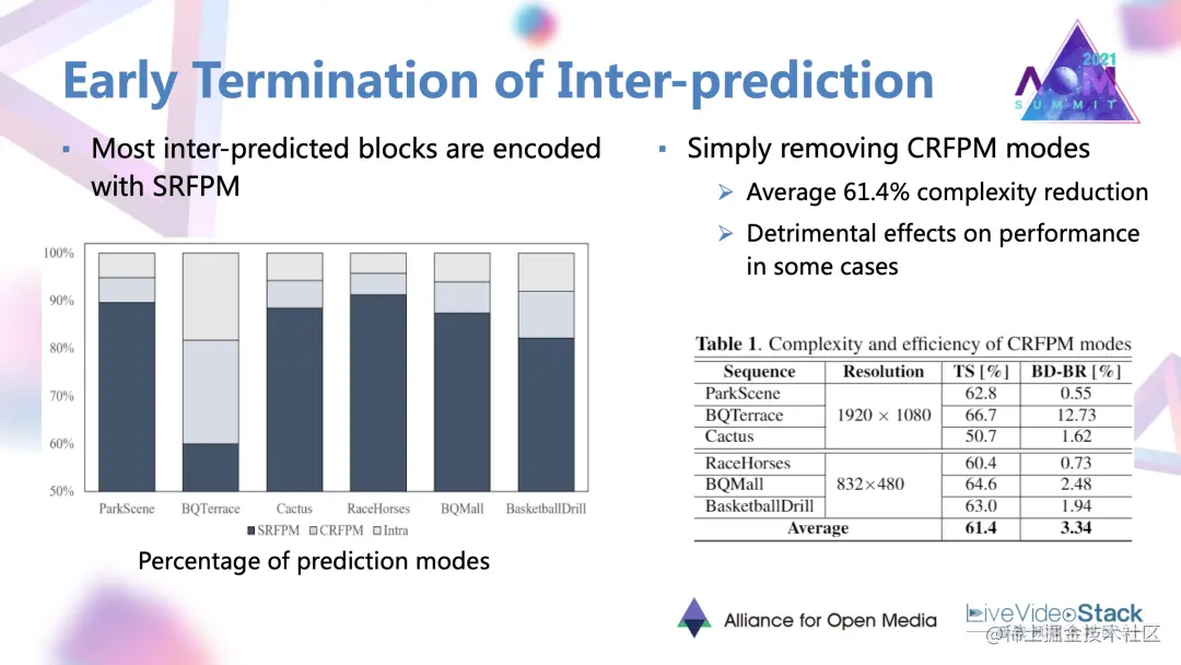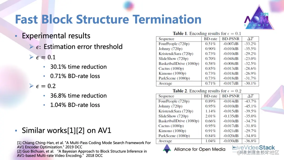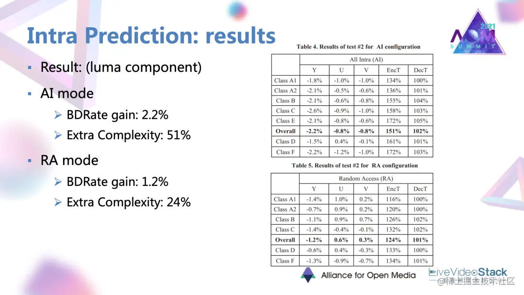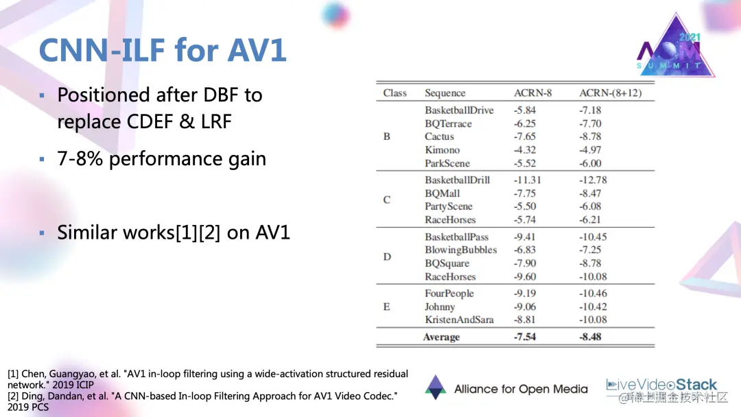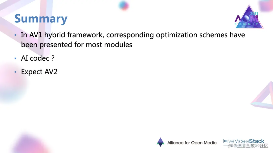 学术界的一些优化工作实际上也涵盖了编码过程的大部分模块。很明显的趋势就是许多深度学习的网络或者方法已经开始与编码的模块进行结合,并取得了很多不错的收益。但是在标准编码器中,这种AI与Codec到底应该结合到怎样的一个程度还是需要被探究和摸索的。所以也让我们期待AOM联盟的下一代编码器AV2吧。