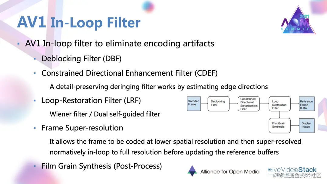 接下来的话就说一下AV1的环路滤波的优化。AV1里面已经有三种滤波器,还包括一种叫做电影(纹理)颗粒合成的,后处理的模块。这几个滤波器或者模块在相应的位置以一种串联的方式对单帧进行增强的。