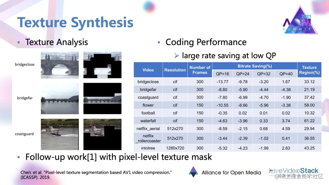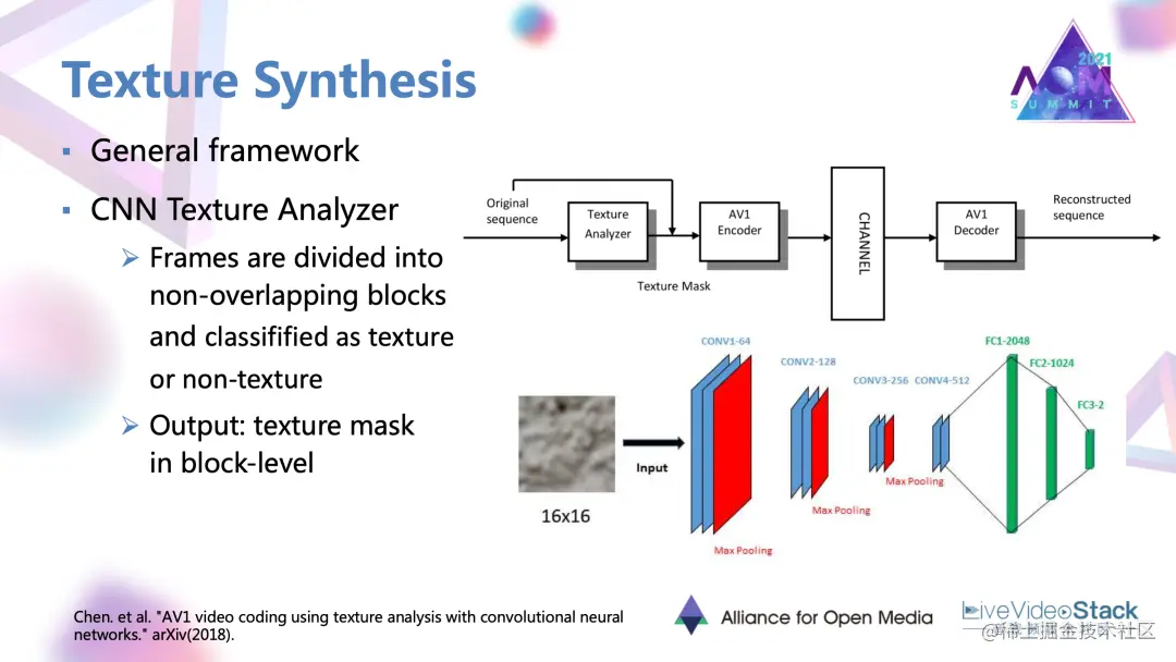 这里要介绍的一个在AV1上的纹理合成工作,也采用了比较常规的框架。首先是一个CNN的纹理分析器。它将原始帧去分割成非重叠的小块,每个小块过分析器得到二分类的判断是否为纹理的标签。最后可以在整帧上得到一个基于块级别的纹理mask。在mask指导下,被认为是纹理的区域就直接通过纹理模式编码而不再进行基于残差块的编码。