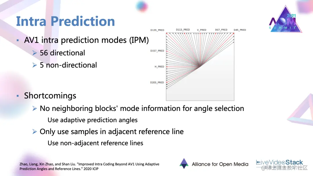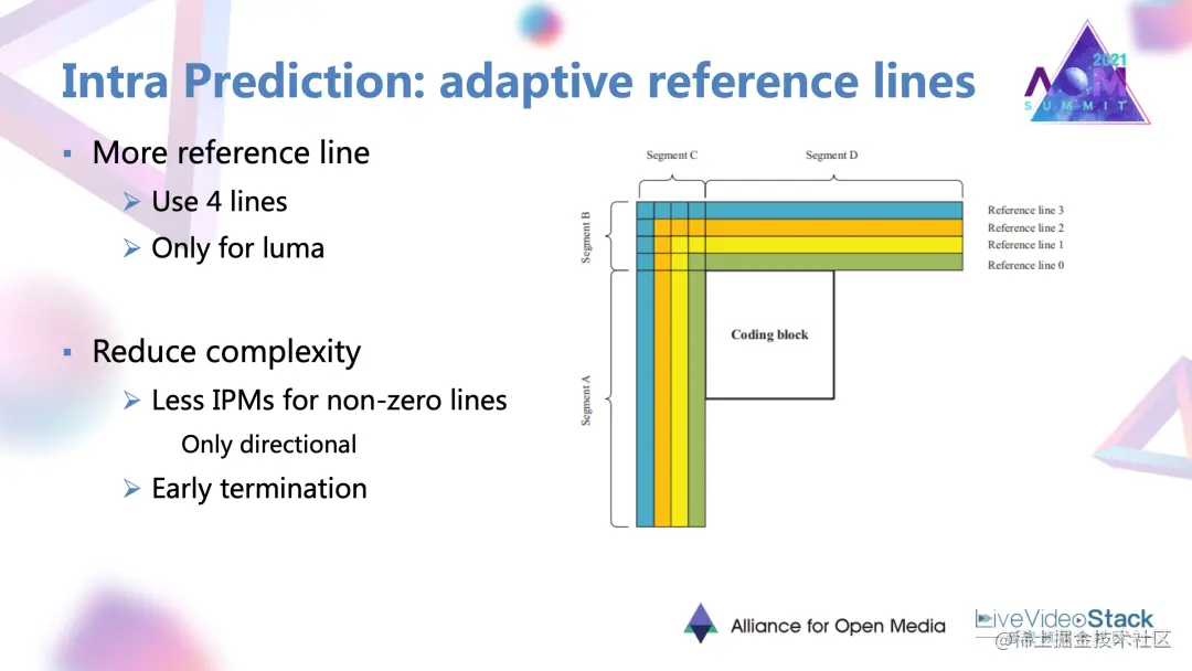 首先是性能优化方面的工作。其中首先是帧内预测的优化工作。AV1本身是有56个方向性模式,5个非方向的帧内模式。这个工作的出发点是发现相邻块的选择的帧内模式往往是相同的或者是相近的,但目前的AV1里面还没有应用到相邻块的模式信息。此外,AV1帧内预测本身只用了一个相邻的参考线中的中间块作为参考,但当对于一些像纹理图案这种相邻样本变化比较大的区域的时,如还是使用单一的参考线,可能会导致残差较大、预测误差较大的现象。所以针对这两点,工作提出了自适应预测角度,非相邻的参考线两种方法。