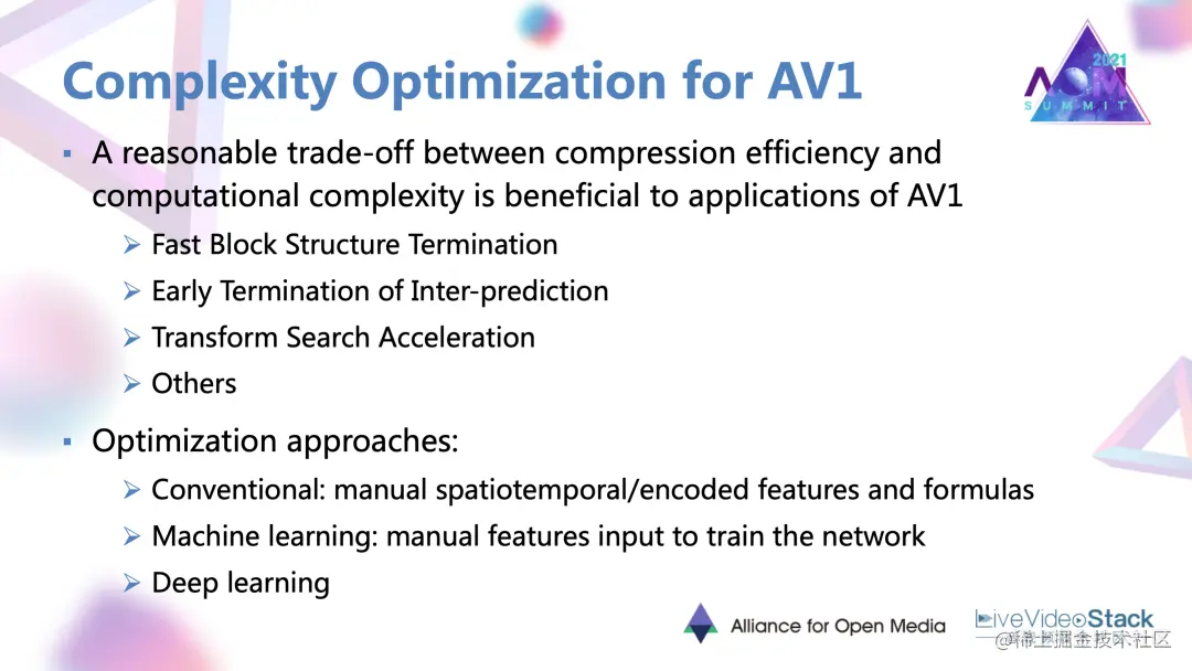 接下来是复杂度优化方面,AV1新增的很多编码工具实际上带来了大量的编码时间,所以对AV1去进行复杂度的优化很有必要,而且会带来很大的收益。目前看到在AV1上的复杂度优化工作主要包含块划分、帧间预测、变换搜索方面的加速工作。尽管这些加速工作是针对不同模块,它们也有一些比较共通的路径。