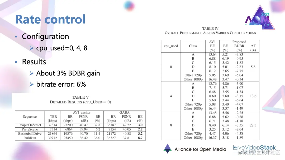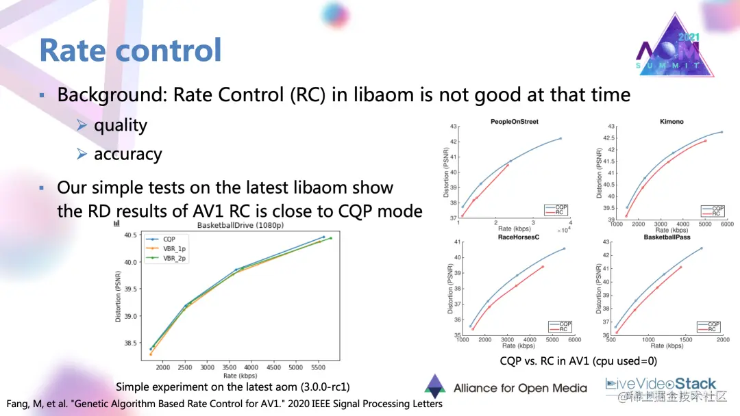 码控模块的目标是对序列各帧、各个编码模块去分配一定的码率,使得实际输出的码率接近目标的给定码率。这个工作里面首先也是对当时版本的码率控制进行了测试,发现AV1当时版本的码率控制在RD性能以及码控准确度方面有所不足。我们也对目前版本的码控方案进行了简单的测试,发现它在性能上其实与 CQP已经比较接近。不过在码控准确度方面还可以有一定的改进。