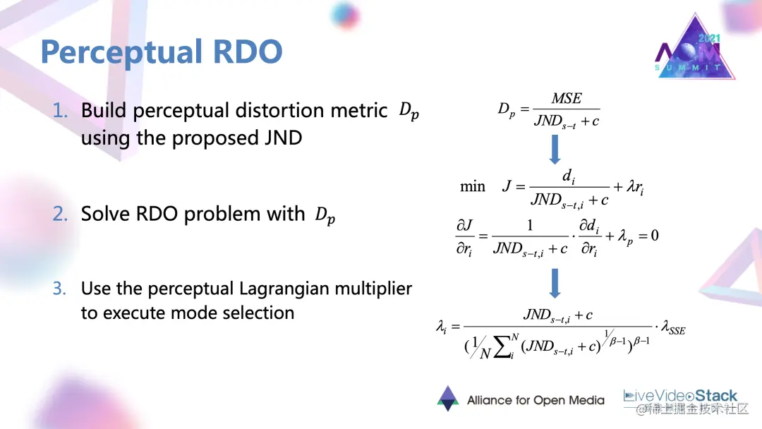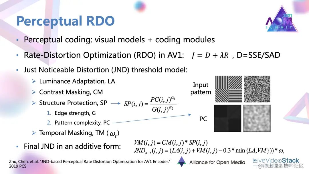 接下来是一个对于率失真优化和RDO的优化工作,是我们实验室团队和谷歌共同合作。它对原有的RDO进行了一个感知优化。整体的感知编码的概念是想把很多反映人眼主观感受的一些视觉模型。最常见的可能就是SSIM、VMAF这种质量指标模型。它与特定的编码模块相结合,达到一种去除感知冗余的目标。