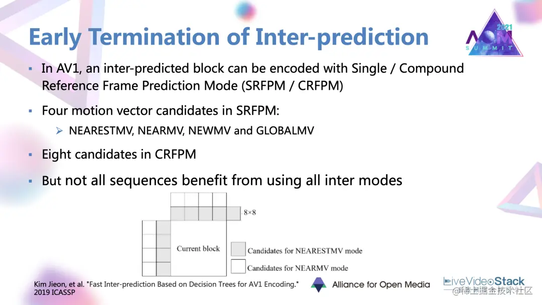 在AV1里面。目前提供了基于单参考帧,以及混合的基于双参考帧的帧间预测模式。在这两种模式下都有一些很丰富的运动向量。这篇文章的出发点,发现并不是所有的序列都会因为这些丰富的候选模式而产生很大的编码增益的,可以进行一些简化。