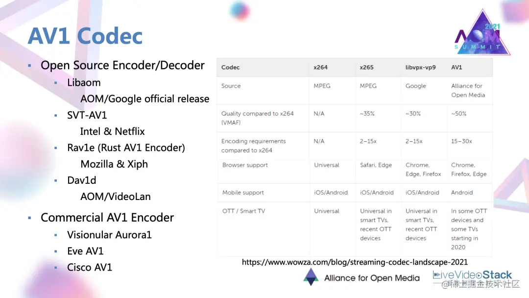 首先介绍一下AV1编码标准。AV1是由开放媒体联盟AOM阵营提出的面向互联网流媒体的开发编码标准开放编码标准。AOM是由谷歌主导,并且吸纳了很多ICT领域的大厂加入,例如我们国内的腾讯还有爱奇艺都是联盟成员。AOM建立的初衷是想解决专利问题,形成一些免费开源的编码方案,同时性能超过HEVC。