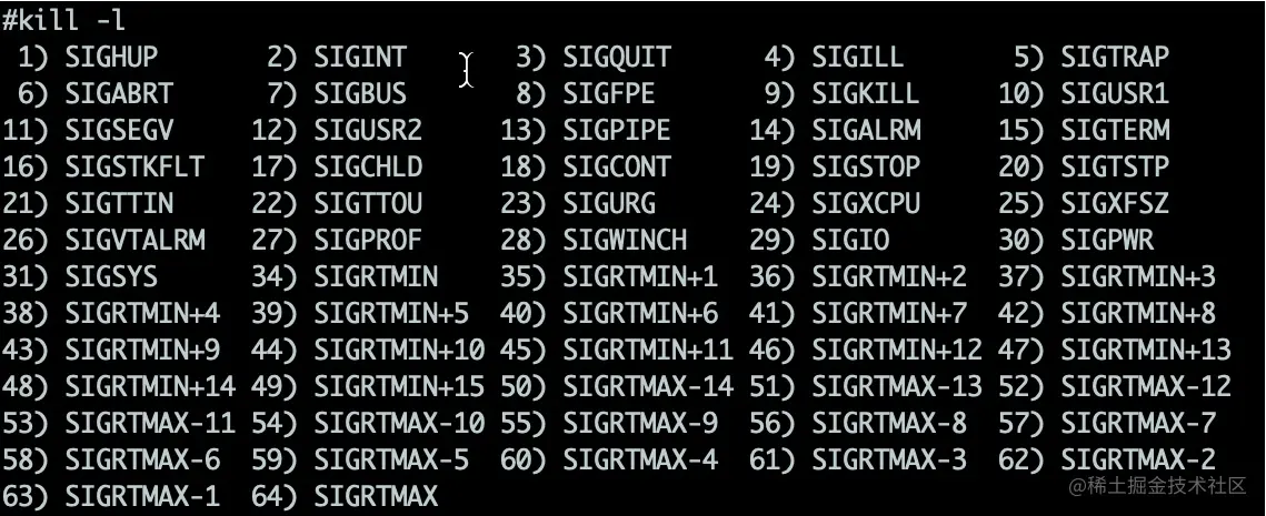 它只是想要给进程发送一个信号而已。使用kill -l可以看到长长的信号列表。