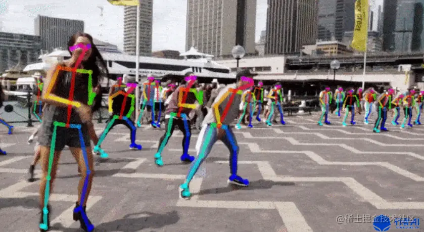动作序列是指姿态估计(pose estimation)生成的关于动作的时序数据,每个时间步的数据由关键点组成,用来表征人的肢体动作。如图1,纯色的点组成了当前动作的关键点,其连线能很好表征当前人物的肢体运动。(详情参见github.com/CMU-Percept…