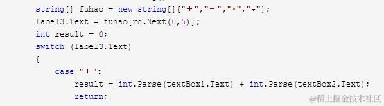 (5)用户可以选择哪种计算类型,比如加减乘除,或可选择软件随机生成四则运算中的一种。 感觉还是这个更有难度一些,不过我先用数组把四种运算存了起来,然后从这个数组里随机选出一种运算显示在label3里面,这样就可以switch(label3.Text)了。 如下: