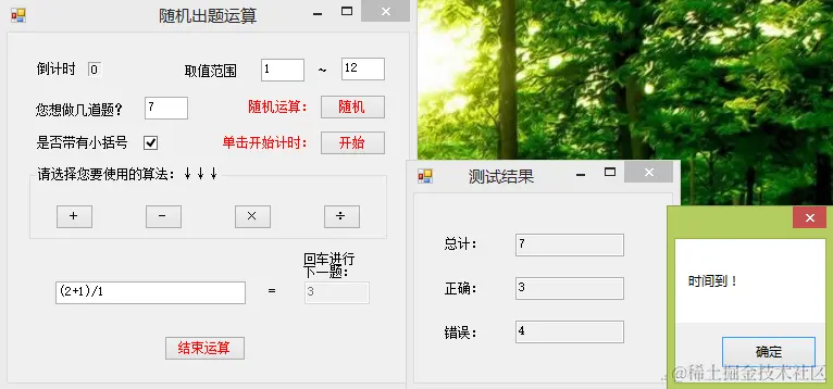 当时间用完,或者点击结束运算的时候,会弹出测试结果并提示时间到。