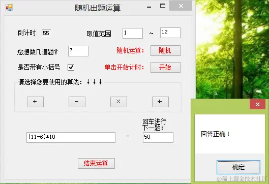 答题的时候给出取值范围,和预想答题数目,然后点击随机,这时程序就会生成一个式子。