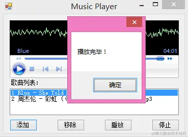 4.播放完关闭文件,然后程序可以给个播放完的提示:这个我们是判断一下WMP中的PlayState播放状态来确定歌曲是否播放完毕,如果状态为Ended就弹出“播放完毕!”消息框。