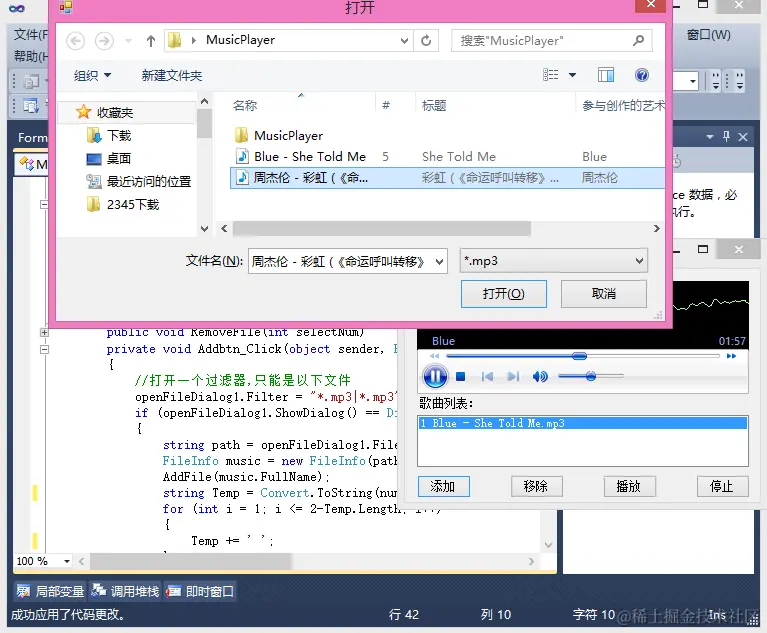 1.要让程序知道文件的路径,可以用一个添加按钮来实现。点击按钮打开文件选择窗口,打开一个过滤器:openFileDialog1.Filter = "*.mp3|*.mp3";从而让程序只获取mp3文件。