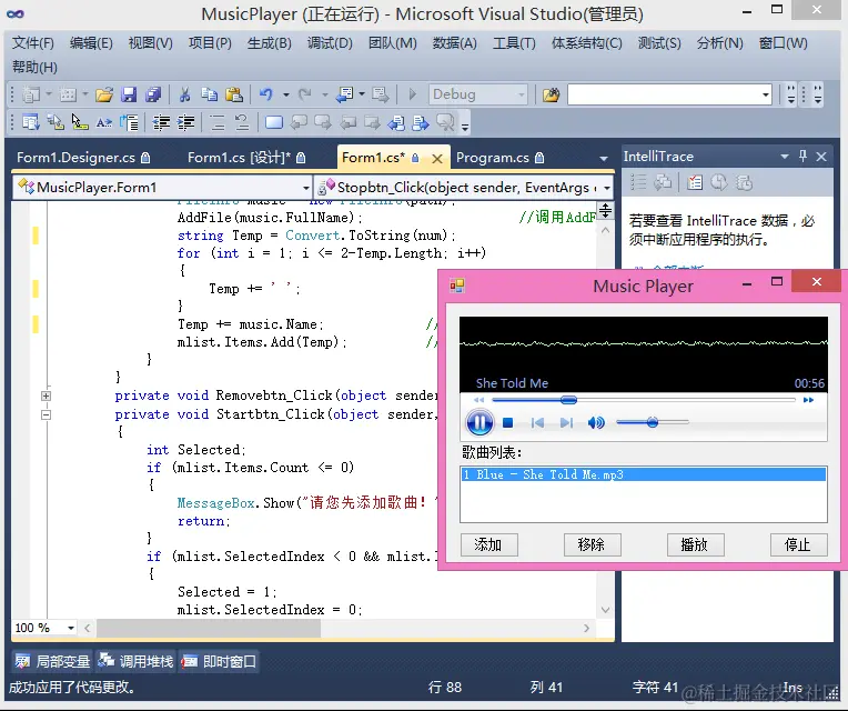 3.播放这个文件:我们是用COM组件,添加了一个WindowsMediaPlayer,这样只需要把需要播放歌曲的索引赋给这个WMP的URL就行了。就是告诉它播放哪一个歌曲。从而实现播放。