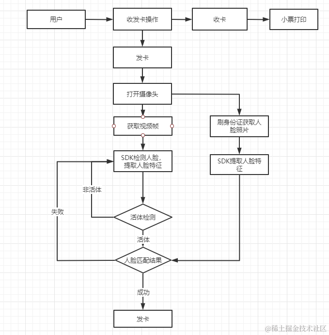 基本流程如下图,用户在自助发卡机前选择发卡操作,这时自助机会打开摄像头,只需要把身份证放到身份证读卡器上即可,然后摄像头捕获到的人脸与身份证上的人脸进行相似度比对,如果比对通过则由发卡机写入信息并进行发卡操作。