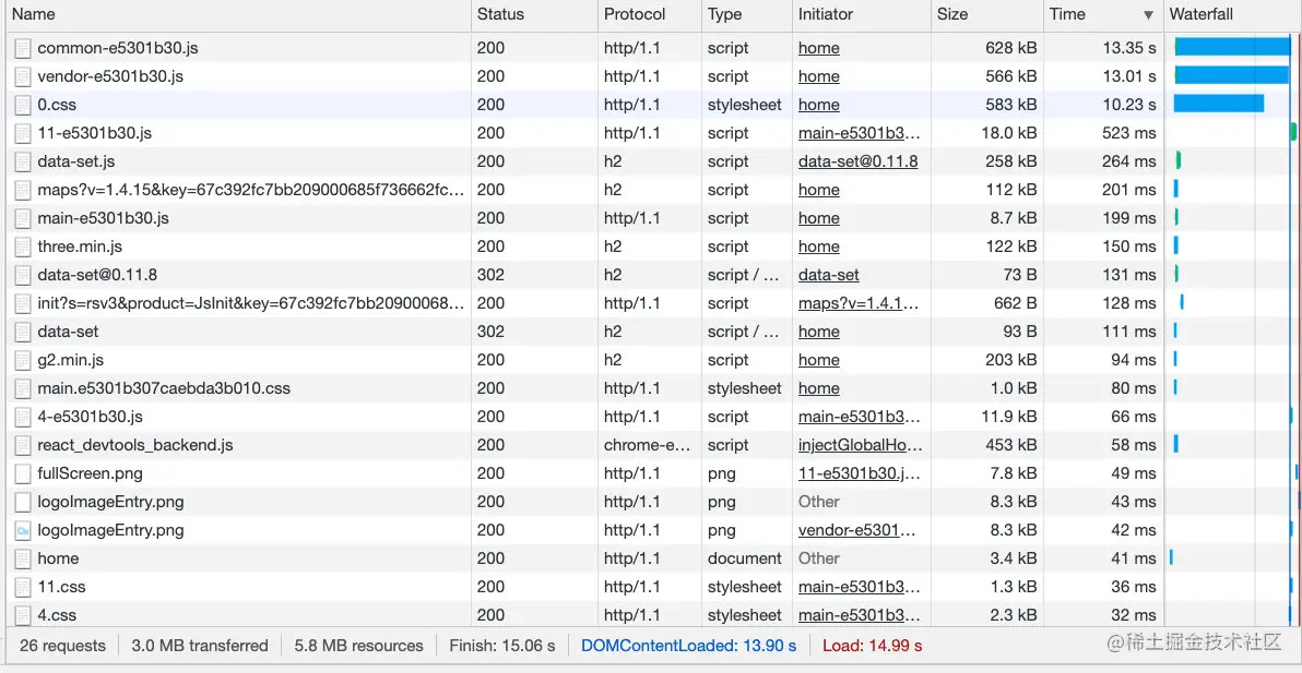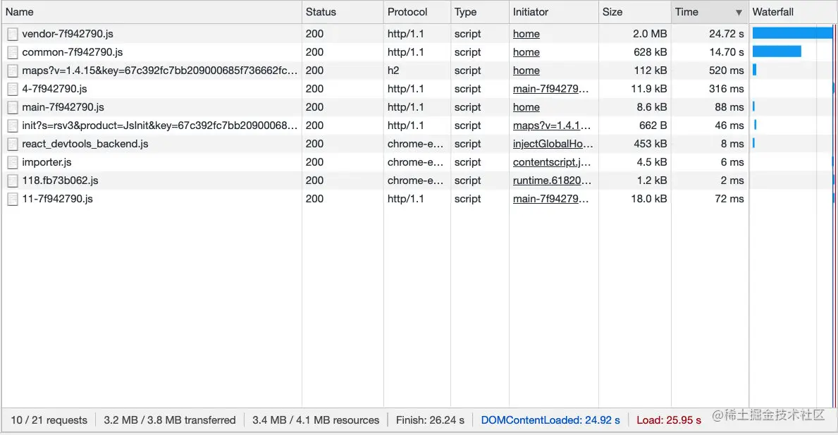 这是目前优化后的代码,可以看到压缩后任然有3.2M,直接部署到服务器后,首屏加载时间过长,达到了26s,估计按照这速度,用户早就等的不耐烦了。