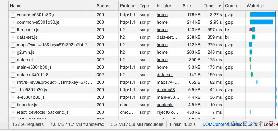 经过优化,加载时间从原来的90s减少到了4s,体积从4M减少到了1M,将较大的第三方资源库使用cdn加速(使用第三方的,有失效风险)。后期需要继续探索的点: