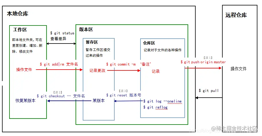 从本地仓库将文件git到远程仓库流程:工作区----> 暂存区 ----> 仓库区 ----> 远程仓库