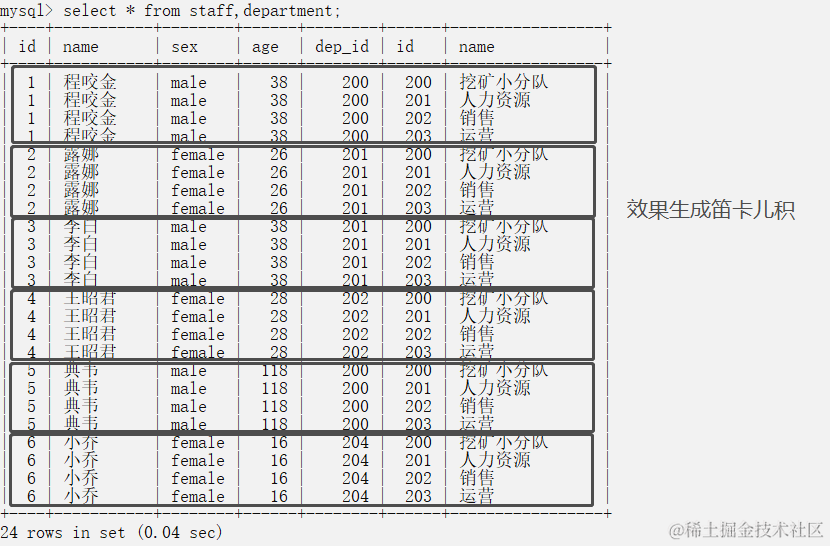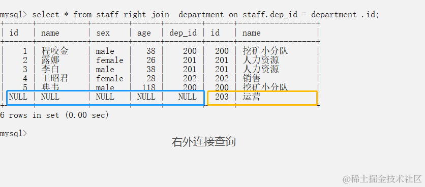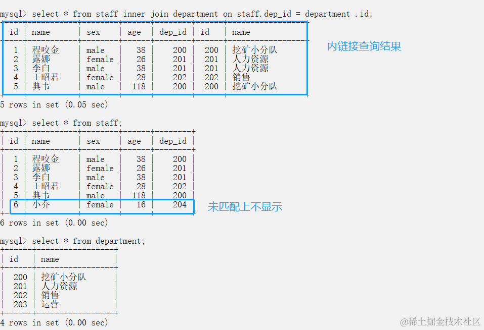 mysql> select * from staff inner join department on department.id=staff.dep_id where department.name='挖矿小分队';