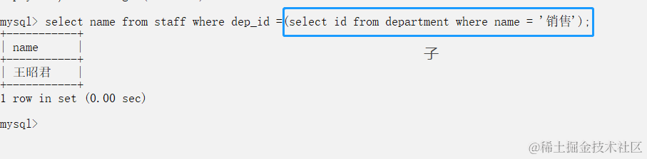 mysql> select name from staff where dep_id =(select id from department where name = '销售');