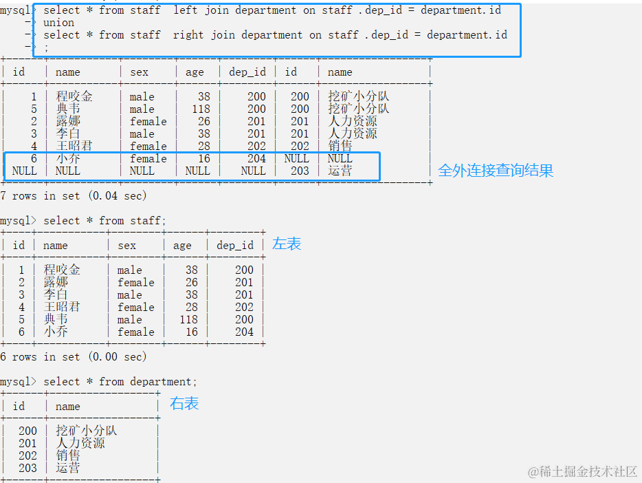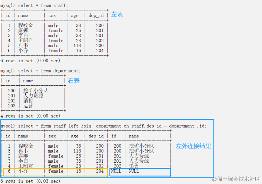 - select * from staff left join department on 条件(表1.字段=表2.字段)