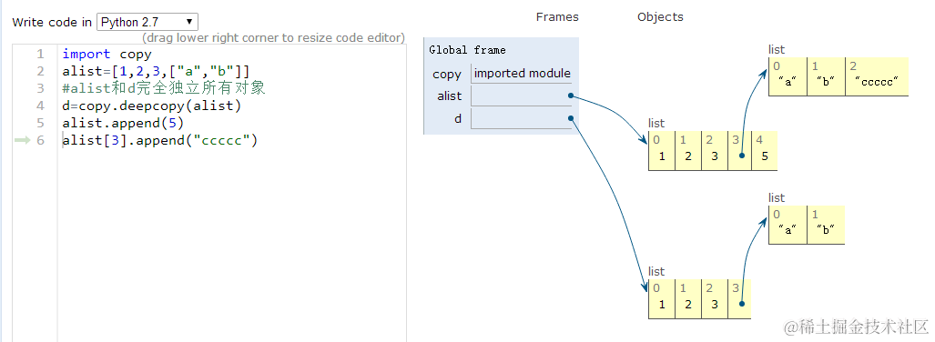 print("浅拷贝:")import copyb=[1,2,3,4,5]print("id b:",id(b))h=copy.copy(b)print("id h",id(h))print(h)h.append(6)print(h)print("id h",id(h))print(b) #浅拷贝新的列表h改变了,原来的b没变。b[1]='n' #列表元素改变后,新的列表也没变print(h)输出:浅拷贝:('id b:', 140165805110552)('id h', 140165805110480)[1, 2, 3, 4, 5][1, 2, 3, 4, 5, 6]('id h', 140165805110480)[1, 2, 3, 4, 5][1, 2, 3, 4, 5, 6]