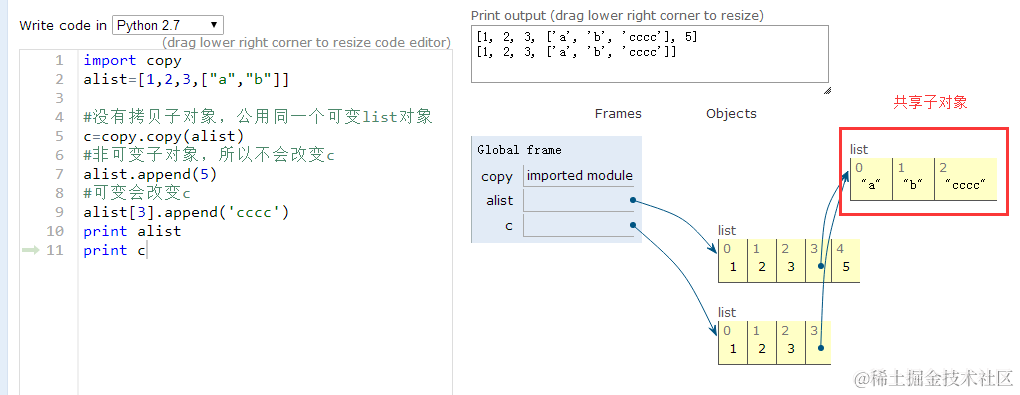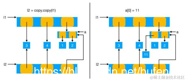 a = [1, 2]l1 = [3, 4, a]l2 = copy.copy(l1)print(l1)print(l2)print(id(l1))print(id(l2))a[0] = 11print(id(l1))print(id(l2))print(l1)print(l2)输出:[3, 4, [1, 2]][3, 4, [1, 2]]140624327425704140624326197400140624327425704140624326197400[3, 4, [11, 2]][3, 4, [11, 2]]