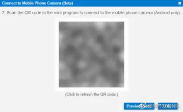 4. 单击 HiLensStudio 界面“接入手机摄像头(Beta)”对话框的“下一步”。对话框显示摄像头推流二维码。