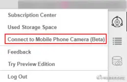 1. 在 HiLensStudio 界面右上角单击用户名,选择“接入手机摄像头(Beta)”。弹出“接入手机摄像头(Beta)”对话框。
