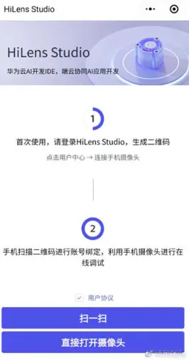 5. 在 HiLensStudio 手机小程序界面勾选“用户协议”,然后单击“扫一扫”,用手机扫描步骤 4 中的二维码。